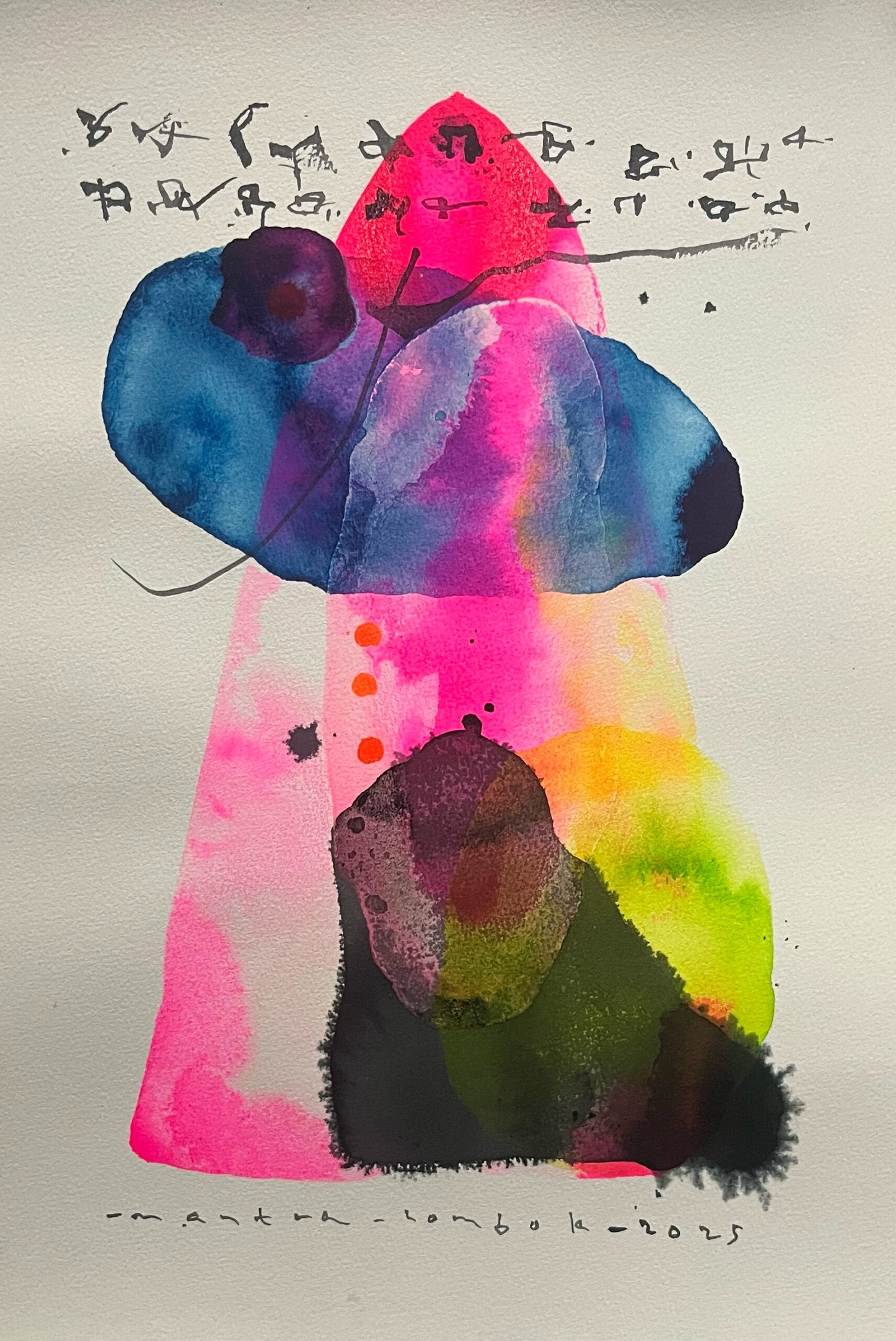 A notable element in Mantra’s practice is his use of watercolor—a medium chosen for its transparency and softness, which contrast with AI’s rigidity. In some paintings, watercolor overlays AI prints, creating blurred and mimetic effects that symbolize the boundary between reality and possibility. These works often show faceless bodies or fragmented anatomy—like psychic maps torn between consciousness and the subconscious.